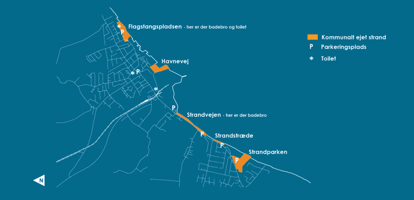Du kan se et kort over de kommunale strandområder her på siden under bilag.